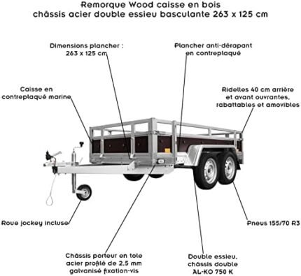 Tema Wood Remorque Double essieux basculante Caisse contreplaqué châssis Acier 263×125 cm