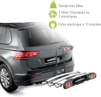 Green Valley 160668 Porte-Vélos Plateforme sur Attelage Voiture Tilting – 3 Vélos Classiques (2 Électriques VAE Max) – Pliable, Inclinable & Sécurisé – 60kg