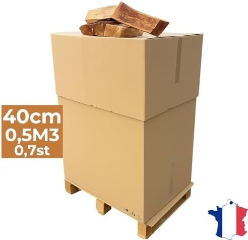 Palette de 0,5m3 de bûches de 40cm sèches étuvées – Bûches rangées manuellement – 0,7 stères Une flambée plaisir rapide ? Pas le temps de se faire livrer plusieurs stères de bois, ou tout simplement pas la place ? Optez pour nos etites palettes de 0,5m3 de bûches de cheminée. Livraison rapide, bois ultra sec, prêt à brûler, et hop une belle flambée ! Bois sec, prêt à brûler, à haute performance énergétique, séché sous étuve. Cette palette de 0,5m3 est remplie de bûches de 40cm rangées manuellement. Ce bois est livré sec (inférieur à 20% d’humidité), et peut aller directement dans votre cheminée. Cette petite palette est facile à manipuler, le bois est dans un box carton ne laissant pas de poussières et morceaux de bois salir votre sol. Points forts : Bois provenant de forêts des Hauts-de-France. Essences de bois : mélange de bois durs (frêne, hêtre, charme, chêne, châtaignier). Bois criblé avant emballage pour éviter les petits résidus de production et les poussières. Format 40cm : pour des poêles, inserts et cheminées, permet des rechargements faciles. Séchage par étuve, taux d’humidité inférieur à 20% : prêt à brûler, haute performance énergétique. 0,5m3 de bûches de 40cm rangées manuellement dans le box carton. Bûches rangées manuellement, par l’ESAT Groupe Malecot, pour un remplissage optimisé. Transparence & qualité : Nos bois proviennent de filières gérées durablement (type PEFC, sous plan de gestion), de forêts locales françaises (moins de 150km de notre usine) et sont contrôlés en longueur et humidité à la sortie d’atelier. Nous affichons clairement le volume, la longueur et le niveau de séchage pour un achat en toute confiance. Chaque produit conditionné dispose d’un numéro de lot, garantissant une traçabilité très fine des bois utilisés (période et lieu d’abattage, date de réception à l’usine, date de production, temps de séchage, …). Nos process de production, d’approvisionnements et informatiques sont conformes à la règlementation européenne RDUE (Règlement européen contre la déforestation). Particularités des bûches sèches étuvées hautes performances : Séchage garanti à cœur, avec un taux d’humidité inférieur à 20%. Allumage très facile et montée en température rapide : feu vif, confort immédiat. Rendement supérieur : moins d’énergie perdue à évaporer l’eau → plus de chaleur utile par bûche. Moins de fumées et de dépôts : vitre plus propre, moins de suie/bistre, appareil et conduit mieux préservés. Moins de particules et d’odeurs : combustion plus propre. Propreté & hygiène : étuvage = bois sans insectes ni moisissures, manipulations plus propres. Moins de consommation à confort égal comparé à un bois demi-sec ou séché naturellement. Idéales pour poêles/inserts récents : combustion stable, réglages plus prévisibles. Disponibles toute l’année : solution premium quand le séchage naturel est insuffisant. À qui s’adresse ce produit ? Vous recherchez du bois sec, prêt à brûler, à haute performance énergétique. Vous utilisez un insert ou poêle à bois récent avec une large surface vitrée, et souhaitez utiliser des bûches qui ne laissent pas de traces. Vous voulez être certain d’allumer rapidement et facilement votre feu de bois. Vous recherchez du bois prêt à brûler, à haute performance énergétique. Vous utilisez principalement des bûches moyennes (40cm) dans votre poêle à bois. Vous avez besoin de bois de chauffage rapidement (48/72h). Vous n’avez pas la place de stocker de grandes quantités de bûches. Conseils d’utilisation et de séchage : Le bois est sec, prêt à brûler avec un taux d’humidité inférieur à 20%. Pas besoin de prévoir une période de séchage chez vous avant de l’utiliser. Entreposez le carton directement près de votre appareil de chauffage au bois. Nous avons conçu un contenant discret et joli qui fera office de range bûche (et d’allume-feu par la suite !).