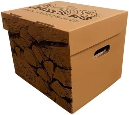 Notre joli carton, de haute qualité, disposant d’un couvercle et de poignées peut être empilé. Une fois vidé de son bois, il pourra être réutilisé ou recyclé.