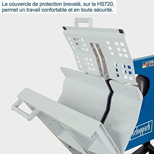 La bascule d’alimentation est couverte par le clapet de protection Scheppach breveté qui protège l’utilisateur contre les éclats de bois et la poignée dans la lame de scie. Lorsque le rabat est ouvert, le commutateur d’alimentation est verrouillé mécaniquement. La course de coupe ne peut être effectuée que lorsque le rabat de protection est complètement fermé. Une ouverture du rabat n’est possible qu’en position de repos.