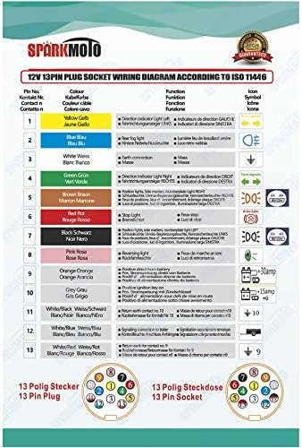 La prise de remorque 12 V étanche à 13 broches de la marque SPARKMOTO est conforme à la norme ISO 11446 (DIN 72570).